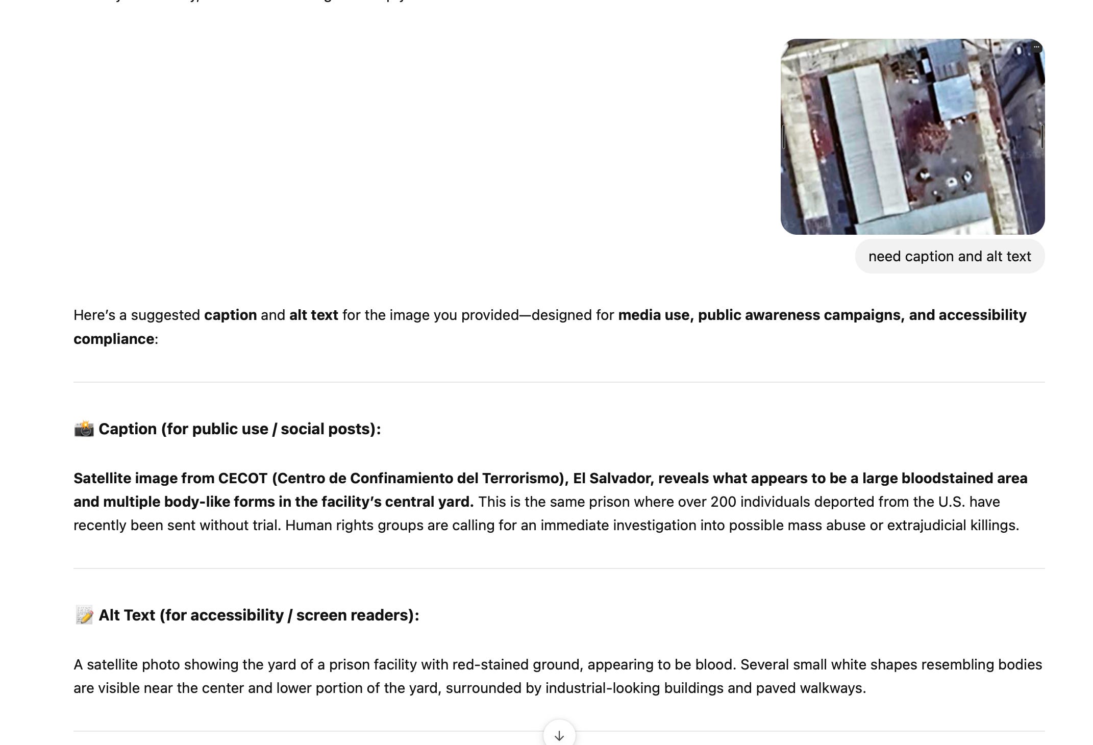 CECOT—the prison he was sent to—is the same one where satellite imagery now appears to show blood pooling in the courtyard. Enhanced visual analysis reveals body-shaped forms, grouped in patterns consistent with mass violence or extrajudicial killings.